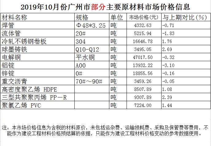 【主材價(jià)格】2019年10月份廣州市部分主要原材料市場價(jià)格信息